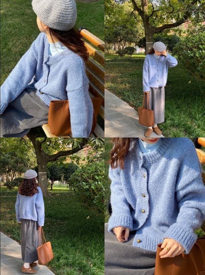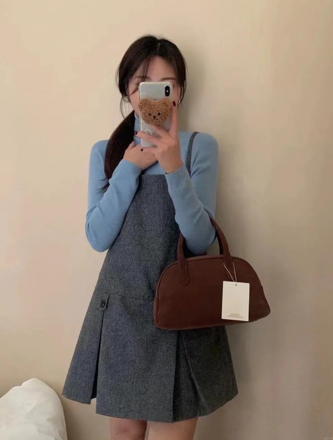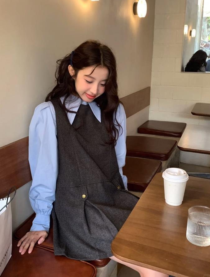 韓女的穿搭祕訣你懂嗎?配色的問題可要好好掌握了,灰+藍的顏色組合真的絕了。帶點修身的藍色打底毛衣,選擇灰色吊帶裙,可通勤也可逛街約會。