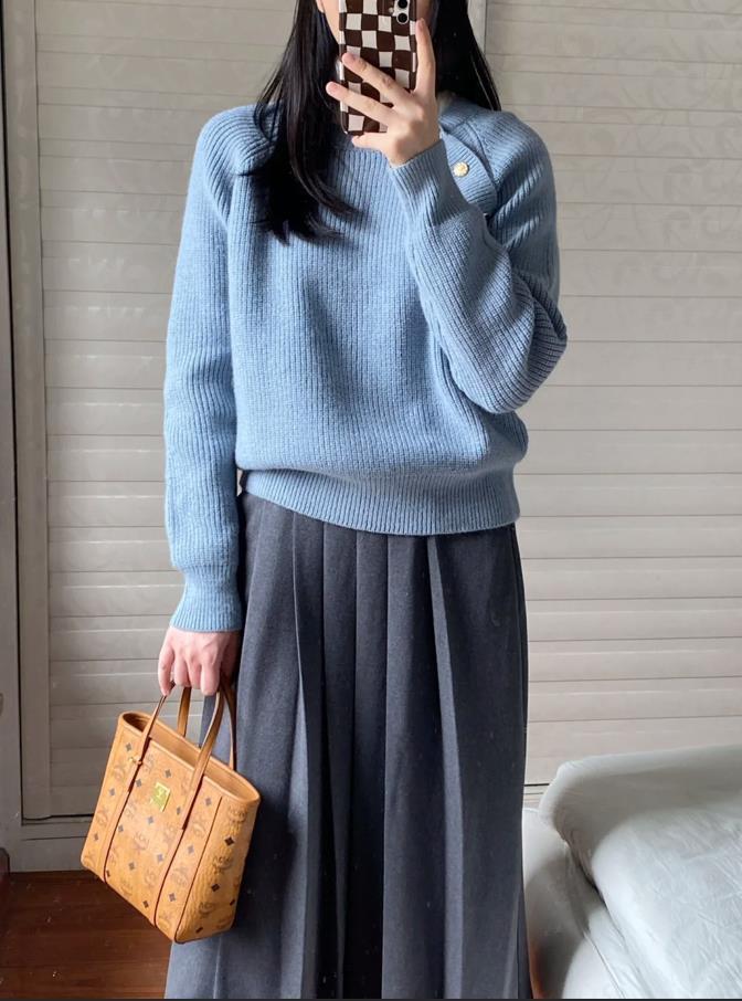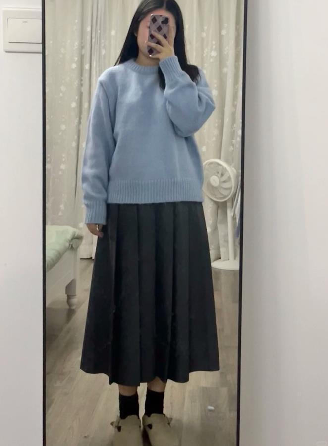 嘗試過藍灰配色的姐妹才知道,這兩種顏色組合在一起有多美吧,清冷感十足的顏色搭配,真的很好看。藍色毛衣+灰色百褶半裙,自帶優雅氣質。