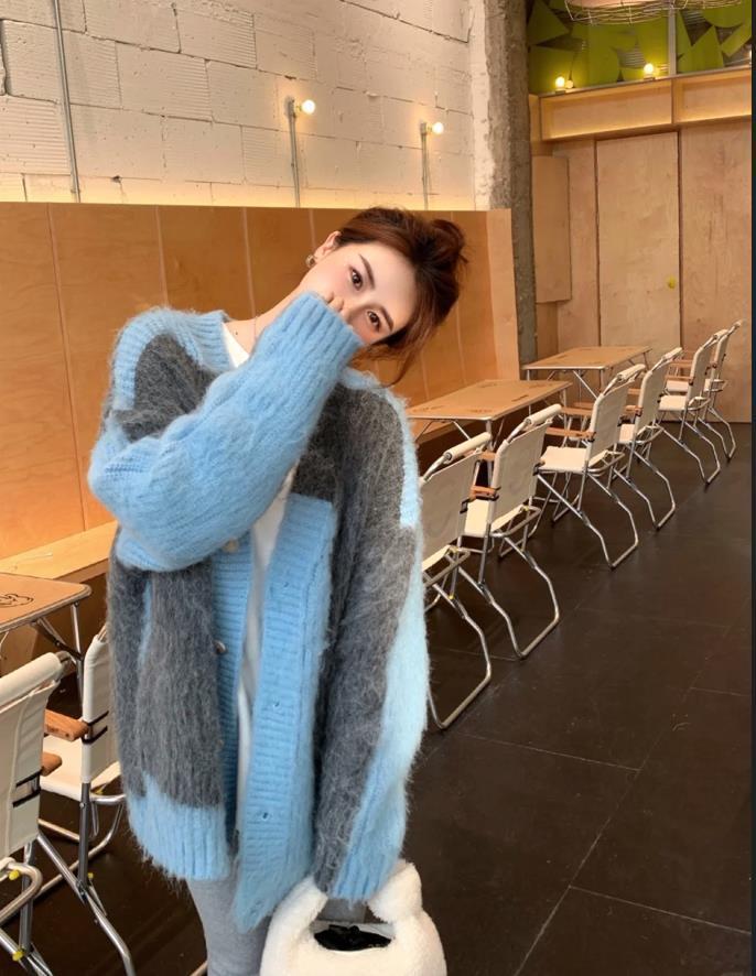 純色系的毛衣或開衫都穿膩看膩了,這種藍灰拼色的款式,瞧着就非常不錯。寬鬆的版型,給足了你臃腫和舒適,顯瘦效果絕了。