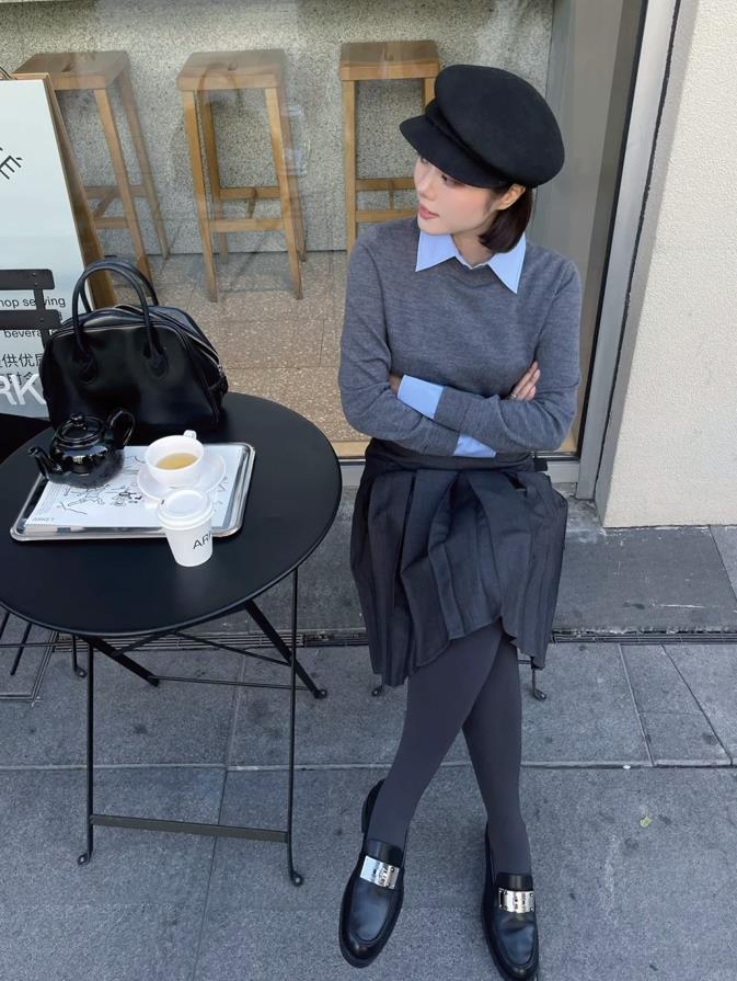 早春,疊穿果斷利用起來啦,灰色毛衣+藍襯衫,學院風十足,看着就非常減齡。下身配的灰色百褶半裙,自帶優雅和減齡,也不失氣質感。