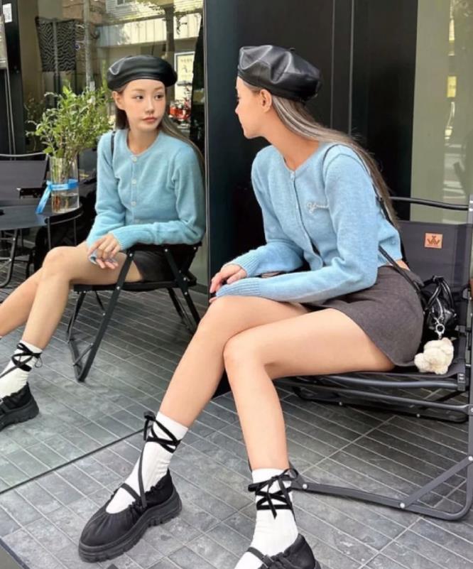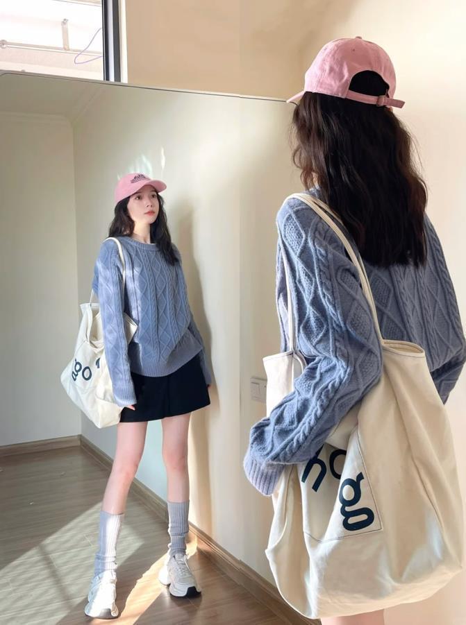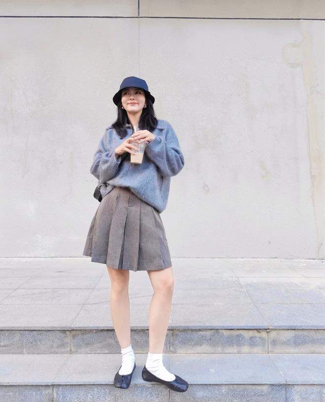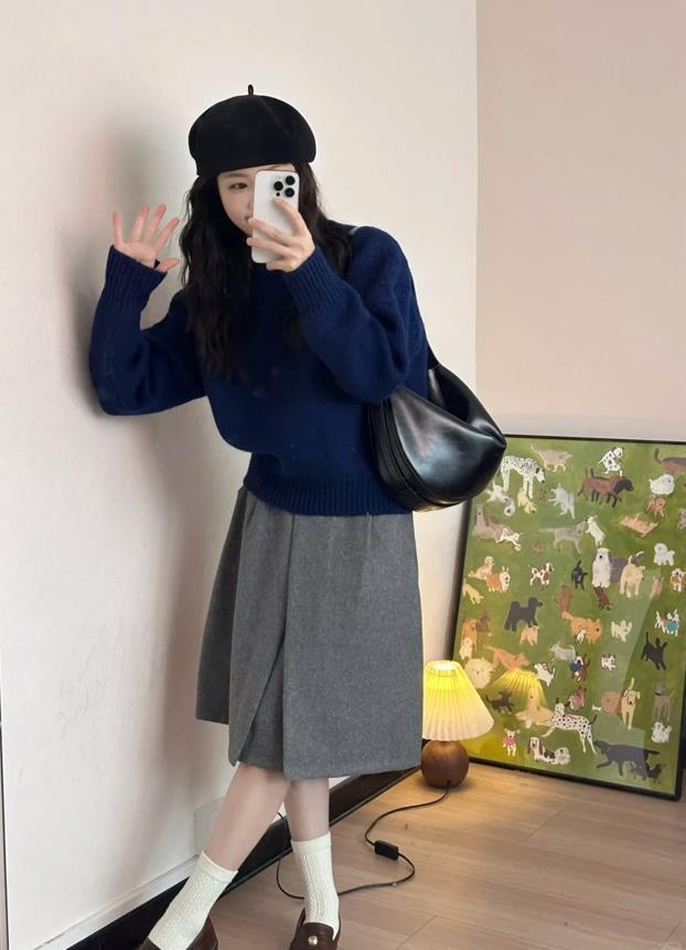 又是一套韓系少女範穿搭,霧霾藍毛衣,帶點慵懶的氣息,又顯白,搭配黑色半裙,腳上穿着灰色襪子,真的高級又好看。