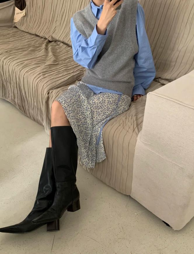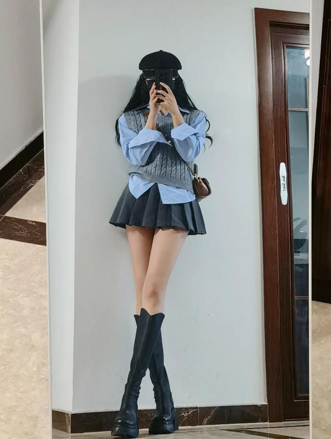 小個子女生可要好好借鑑的一套,灰色毛衣馬甲+藍襯衫,下身也選了條灰色百褶短裙,搭配一雙黑色長靴,輕鬆打造出高挑大長腿。