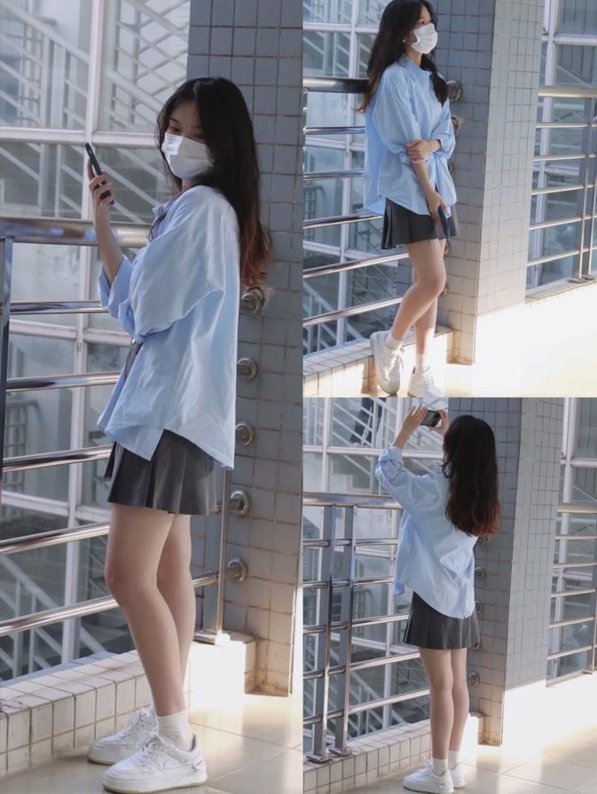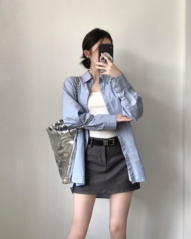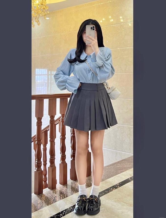 藍灰配色真的好喜歡,這一套看起來也太乖了吧,短款藍色襯衫+灰色半裙,這兩種顏色組合,一整個高級百搭。