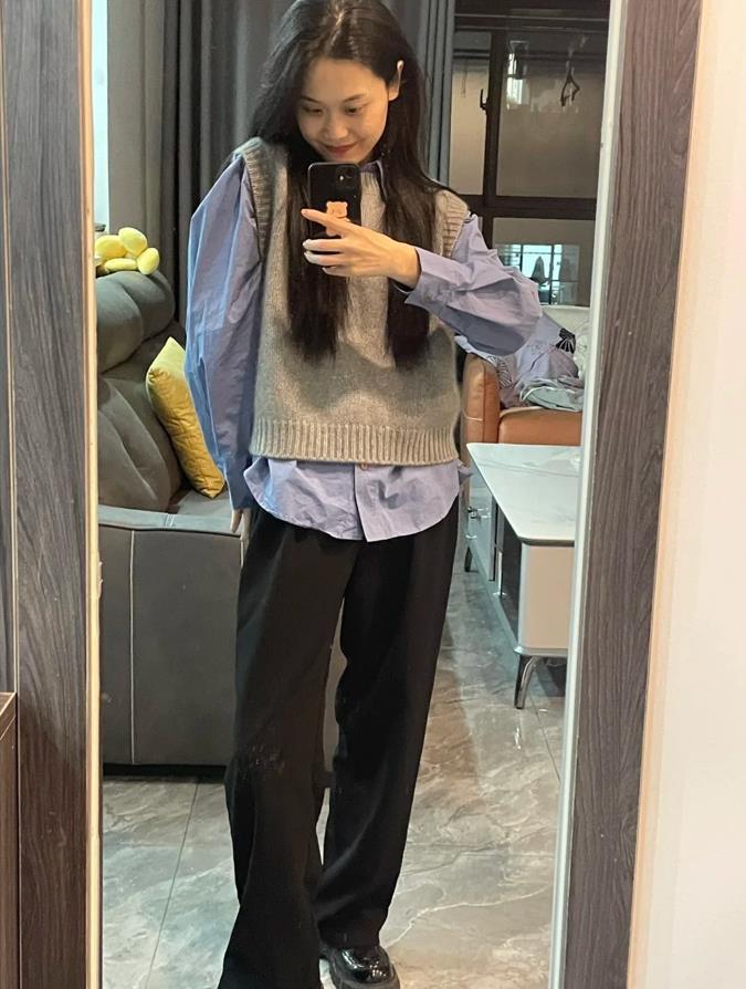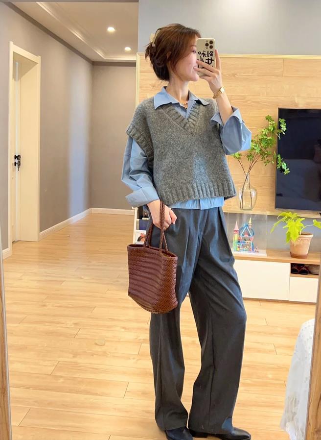 最溫柔的藍灰搭配,春季溫度回升後,姐妹們就可以這麼穿啦,灰色針織馬甲+藍色襯衫,太經典了,完全招架不住呀!