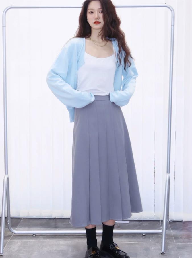 這一套韓系氛圍感學院風穿搭,我真的好喜歡,藍灰配色顯高級絕了,帶點百褶設計的灰色半身長裙,設計感十足。