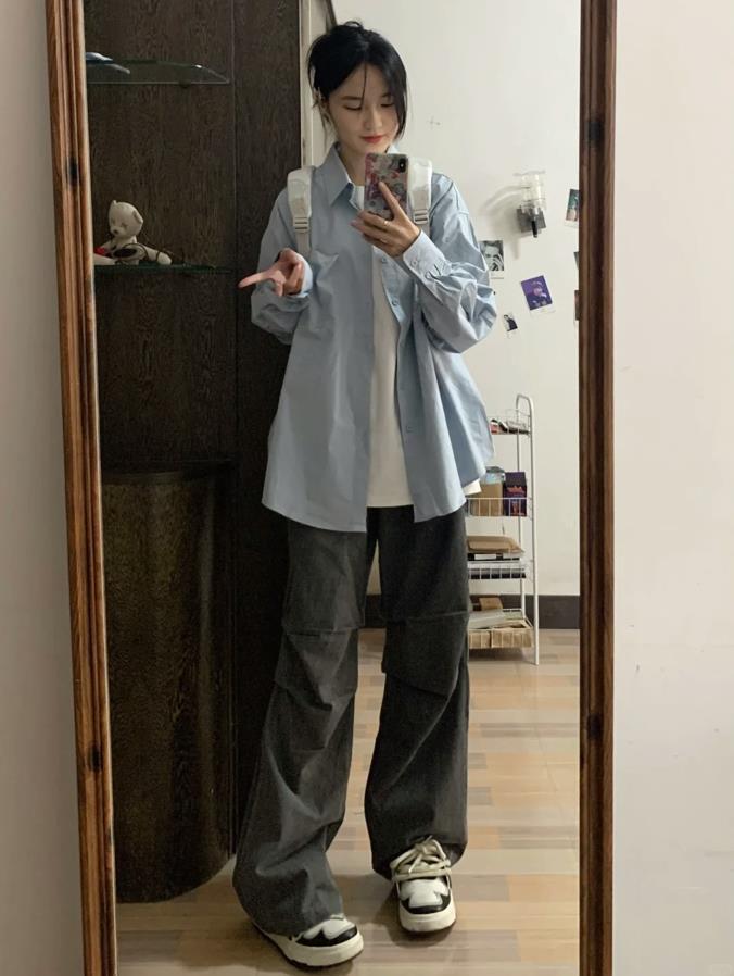普通人也可以挑戰的穿搭,休閒韓系風着裝,瞧着也太不錯了,上衣選的是一件藍色襯衫,顏色很乾淨,版型寬鬆遮肉又休閒。