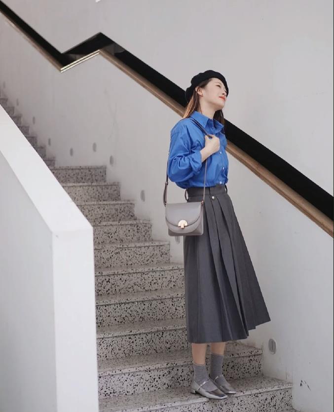 藍灰配色的搭配,真的太時髦耐看了,上班一族的姐妹就這麼穿吧,藍色襯衫+灰色百褶半身長裙,腳下一雙銀色瑪麗珍單鞋,溫柔氣質極了。