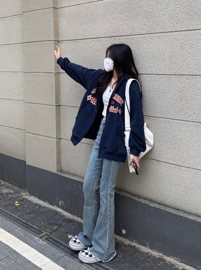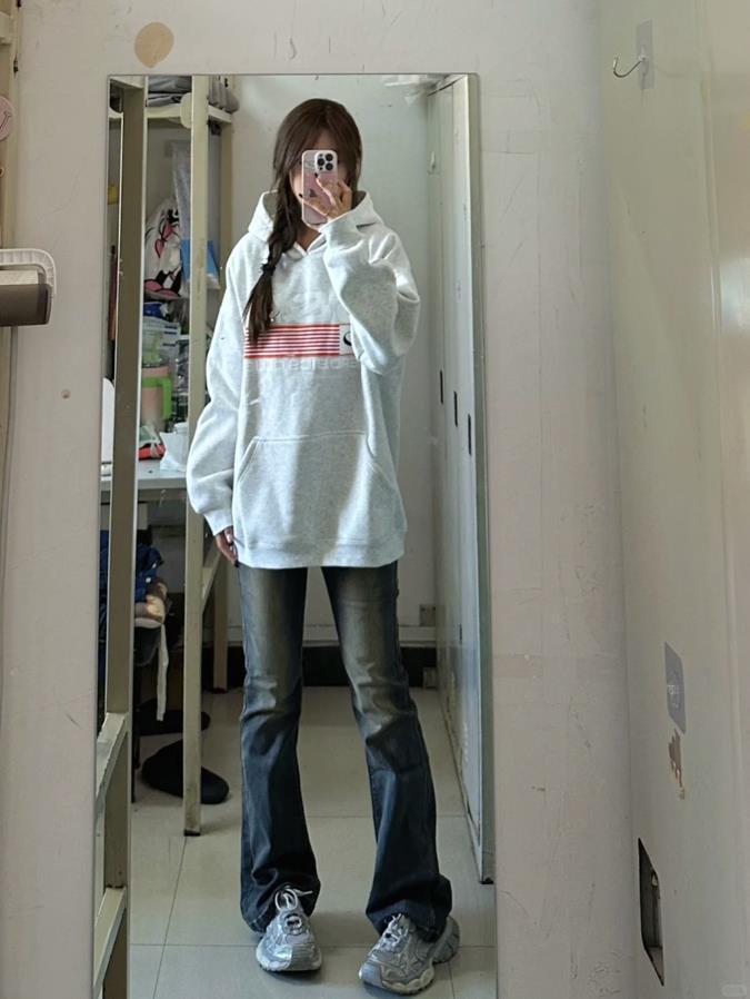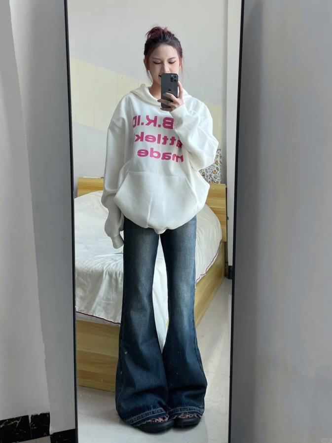 美式衛衣+牛仔馬蹄褲+運動鞋,很不失日常又休閒舒適的一套,適合大學生的穿搭,減齡又不失青春活力。