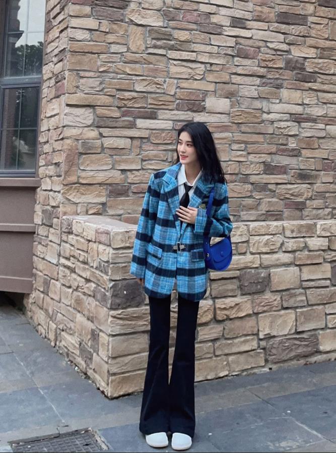 上衣搭配的藍色格紋西裝外套,輕鬆對整個造型進行了點綴,很吸睛。
