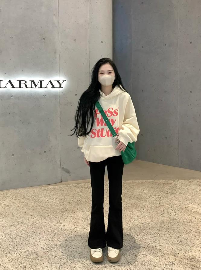 黑色馬蹄褲穿起來也太顯瘦了,衛衣還挺厚實的,應對早春的溫度足夠了。