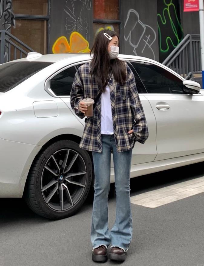 好喜歡這一套啊,格子襯衫+復古牛仔馬蹄褲,微喇的版型真的很驚豔人,這個顏色比黑色還顯瘦,是偏淺藍的顏色。褲長堆一點在鞋子上,顯得雙腿很修長又細。