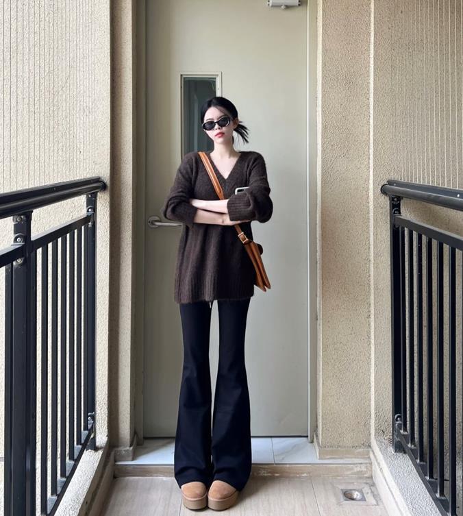 可顯瘦的一套了,深咖色毛衣+黑色馬蹄褲,寬鬆的褲腿,能輕鬆遮掩起腿部的缺點,顯瘦效果絕了。