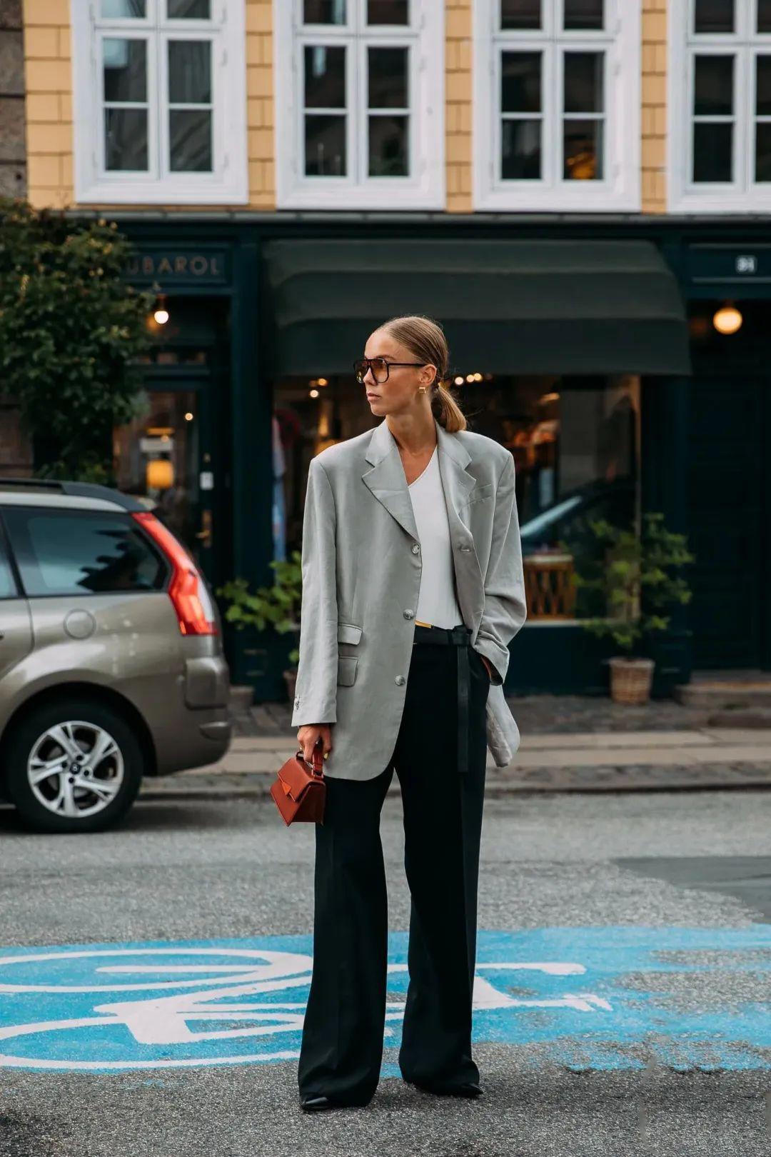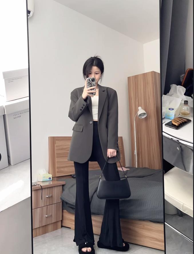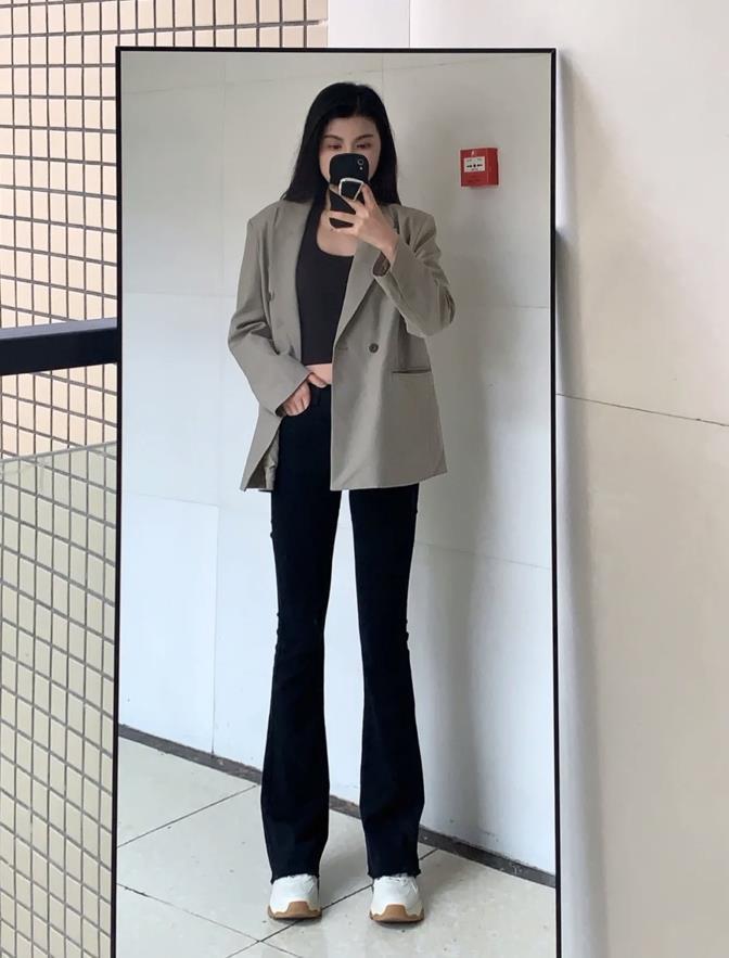 經典黑色西裝馬蹄褲,比起傳統的西裝褲可時髦太多了,搭配背心+灰色西裝,腳下是一雙運動鞋,氣質感直接拉滿了。
