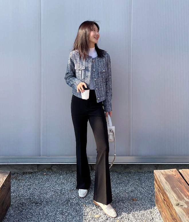 這條黑色西裝馬蹄褲也太太太顯腿長了,穿起來就直接不想脫下來了,關鍵是非常顯瘦顯腿長。微微的喇叭形狀很修飾腿型,搭配小香風外套,日常通勤又簡約。