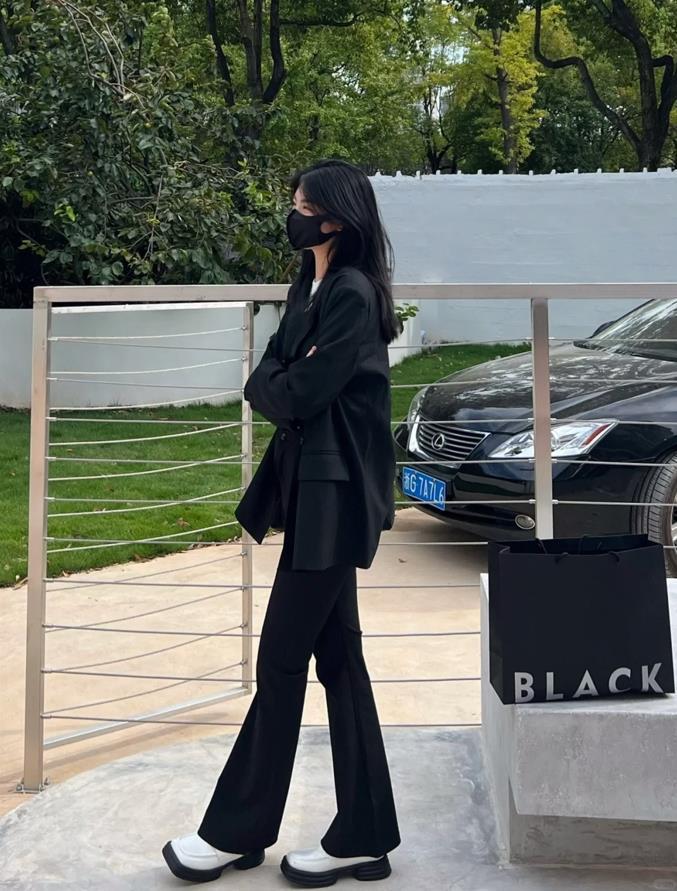 西裝馬蹄褲配西裝,真的好絕啊,雖然這一整套都是黑色的,但在視覺上卻非常顯瘦。白色的內搭和鞋子,都能大程度減弱黑色帶來的沉悶感。