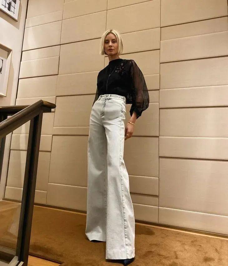 而這所謂的“馬蹄褲”說白了就是喇叭褲的升級版,整體的版型上和傳統款有一定區別。就是褲腳要比傳統的大,馬蹄褲從膝蓋位置開始呈現出微喇感。