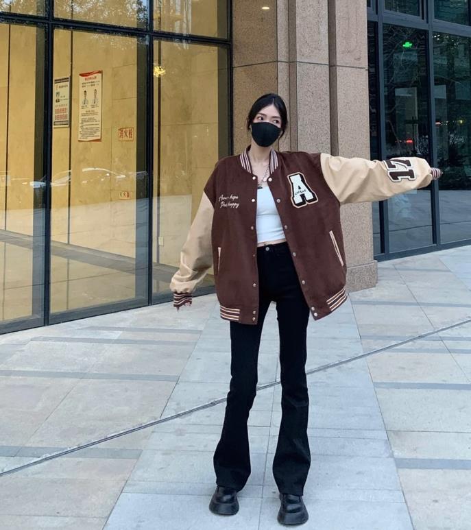 開春都給我這樣穿,太太太好看了這套,黑色馬蹄褲,穿起來可顯瘦了,選擇一件棒球服外套來配,青春活力感十足。
