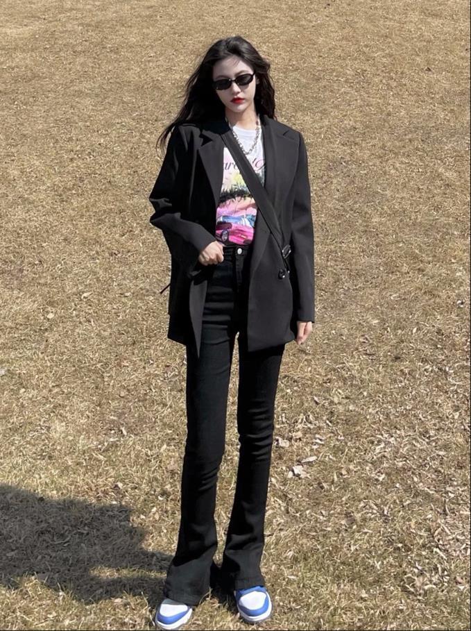 黑色西裝+黑色馬蹄褲,這腿長一米八,版型很正的黑西裝,搭配同色的馬蹄褲,又酷又辣的,腳下選擇一雙運動鞋來配,就又多了幾分休閒運動氣息。
