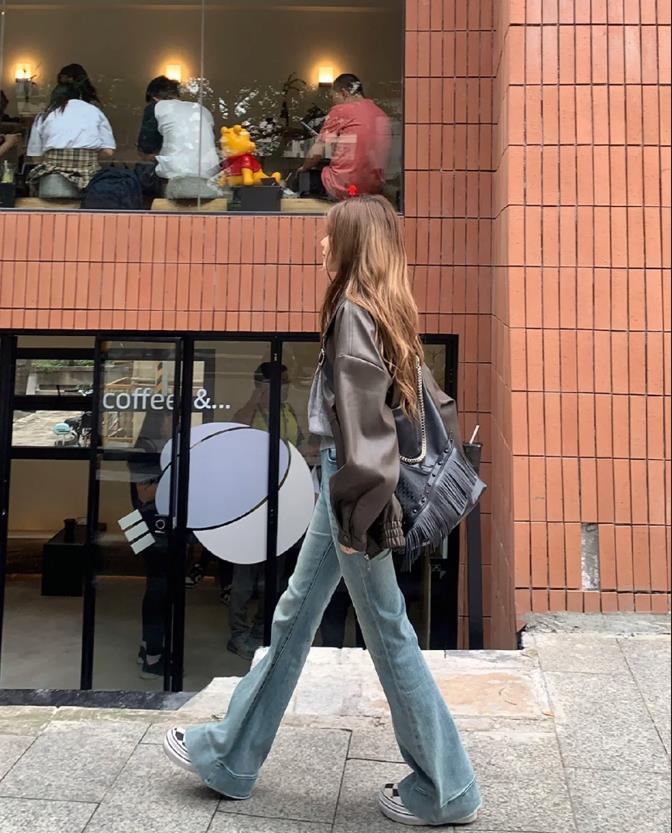 今年春天皮衣外套可是超火的,酷酷的又不失帥氣感,搭配牛仔馬蹄褲,真的好顯瘦又颯啊。顏色是比較復古的水藍色,微喇的版型,可以讓你秒變大長腿。
