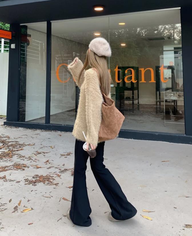 慵懶感十足的一套,黑色馬蹄褲也太顯瘦了吧?那麼經典百搭時髦的款式相信誰都不會拒絕的吧?簡單配了件寬鬆基礎毛衣,可舒適耐看了。