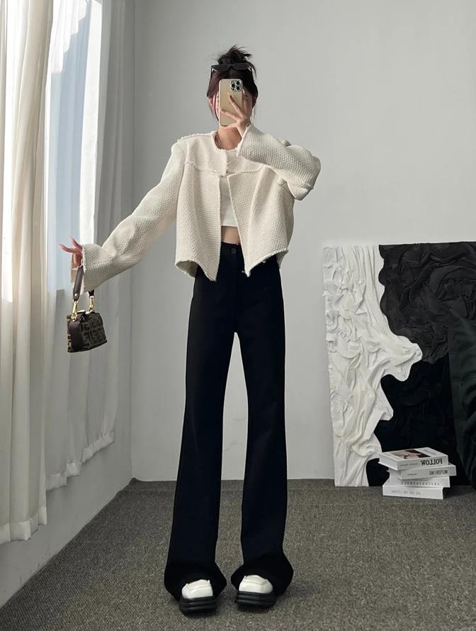 春季就這樣穿吧!上班通勤,或者是日常逛街都非常合適,黑色西裝馬蹄褲,微喇的版型,實在是太讓人喜歡了。選擇與西裝外套的搭配,大女人風就打造起來了。