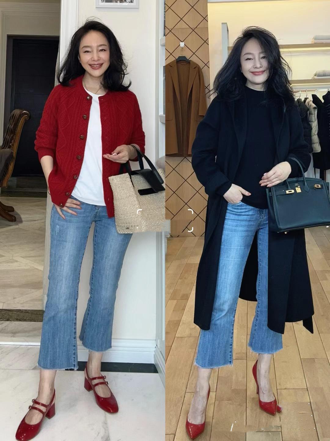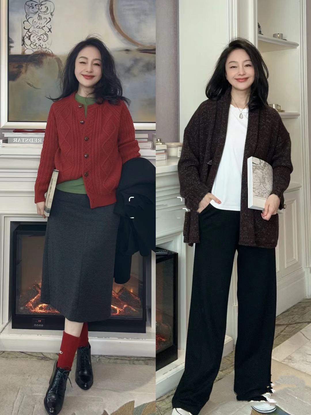 四五十歲的年紀,依然擁有自己的腔調感。時髦復古又精緻的穿搭、更是耐人尋味。像這種櫻桃紅的針織衫、配上基礎款白色T恤,視覺上的提亮效果更強。