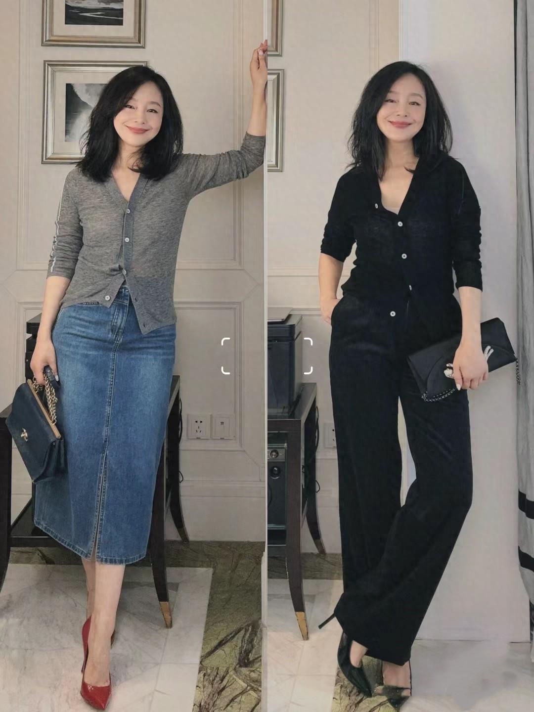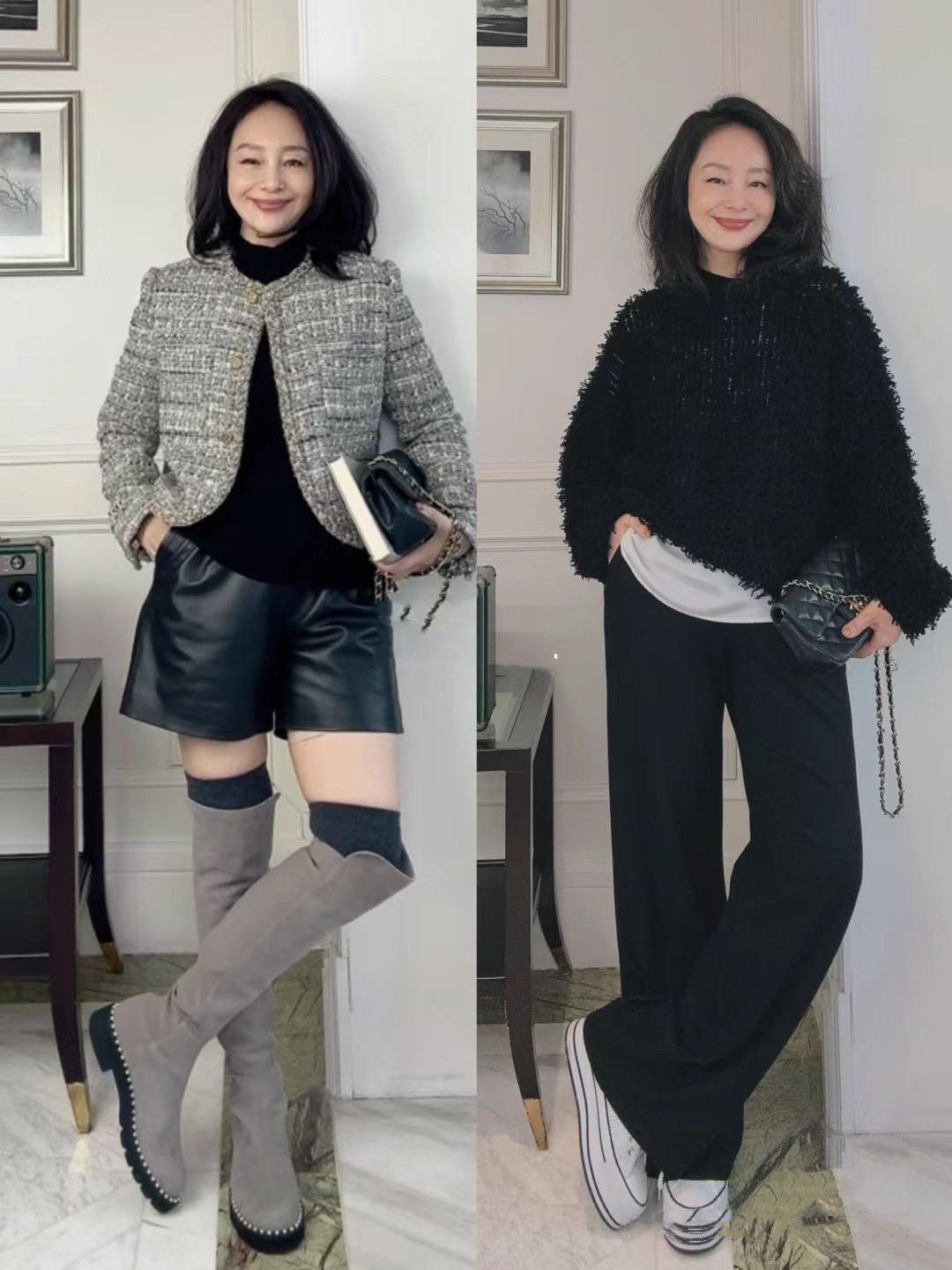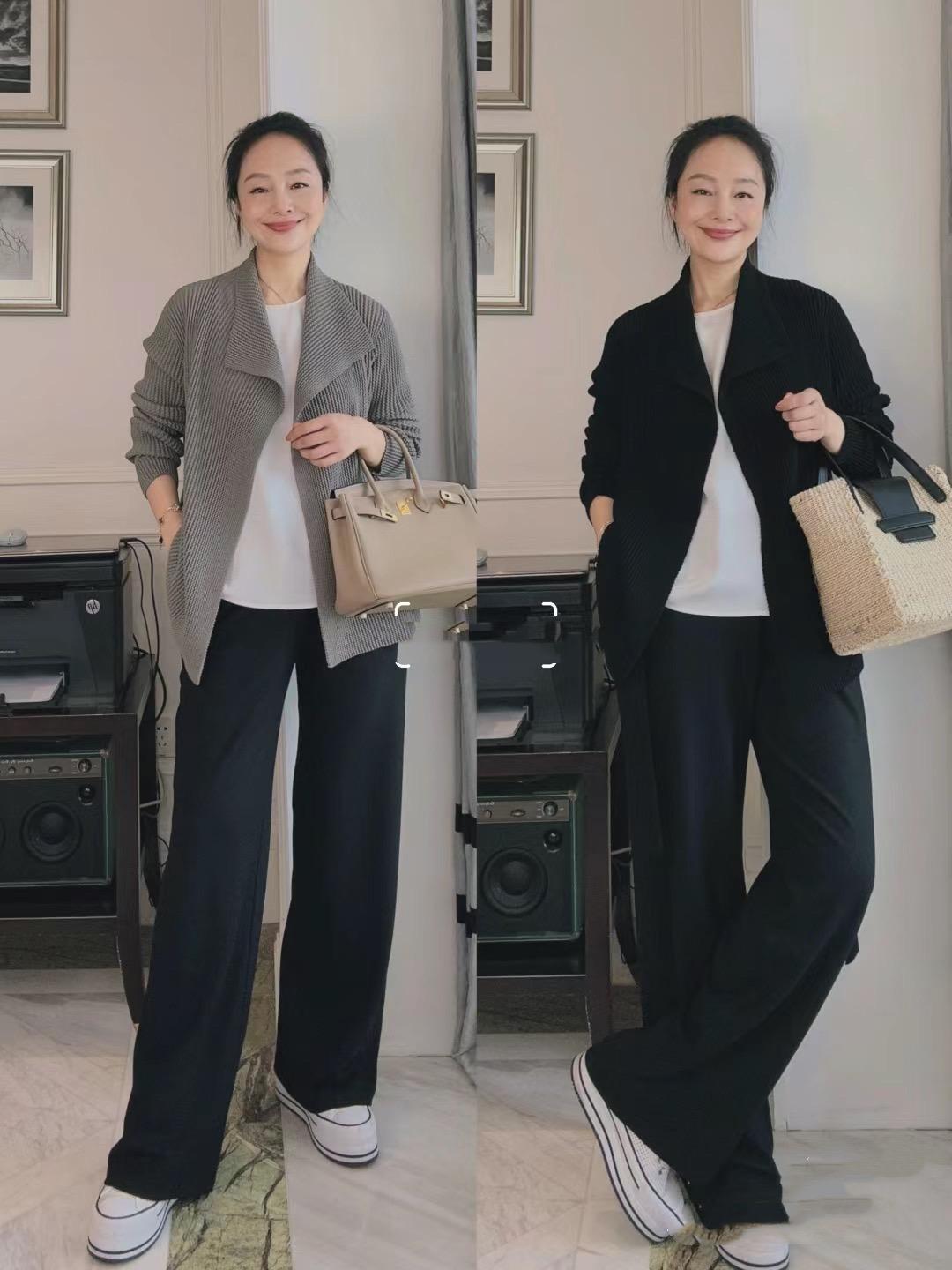 四五十歲的年紀,依然是逃不過黑白灰的穿搭定律呀。這種極簡風造型,利落、大方、減齡又顯貴,有一種自帶氣場的高級美。