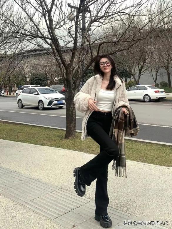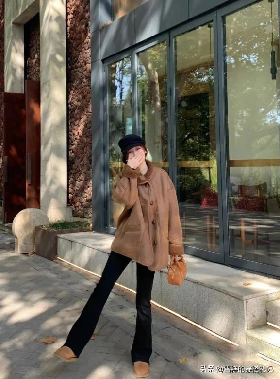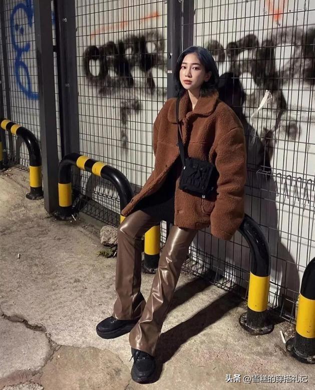 配色在穿搭中起到的作用是不可或缺的,例如棕色系的羊羔毛外套與黑色馬蹄褲的搭配,可以通過棕色系的包包和雪地靴來進一步凸顯整體感。這種配色呼應的穿法被稱爲美拉德色系穿法,這種看似不經意的細節點綴,其實正是提高整體造型時尚度的關鍵所在。