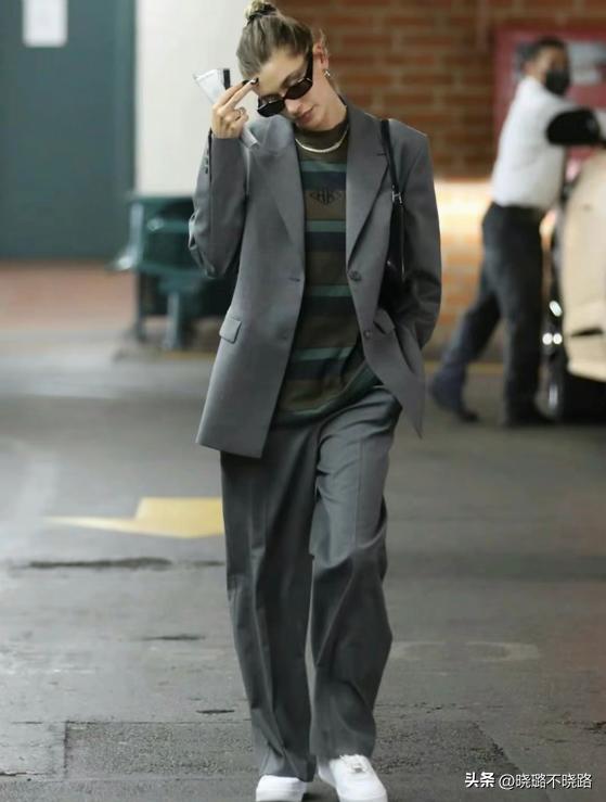 同樣是灰色的套裝穿搭,爲什麼bella這套就顯得時髦多了呢?這是因爲bella穿套裝,但是內搭換成了休閒的款式,再搭配休閒的鞋子和金屬色的鏈條、墨鏡等,給穿搭增添了許多時尚色彩,將灰色的“正經感”一掃而空。