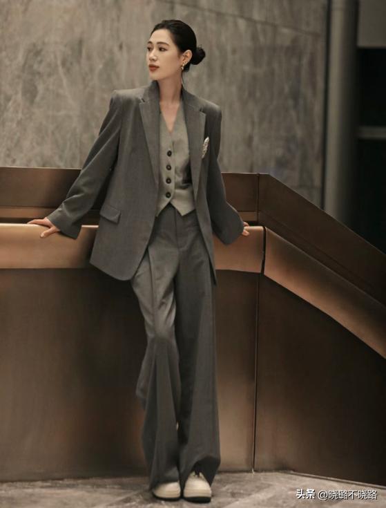 這套穿搭的問題在於選擇了灰色的套裝,並且是職場套裝,這樣的單品讓灰色顯得很呆板,上班味兒太重了,因此沒有時尚感。