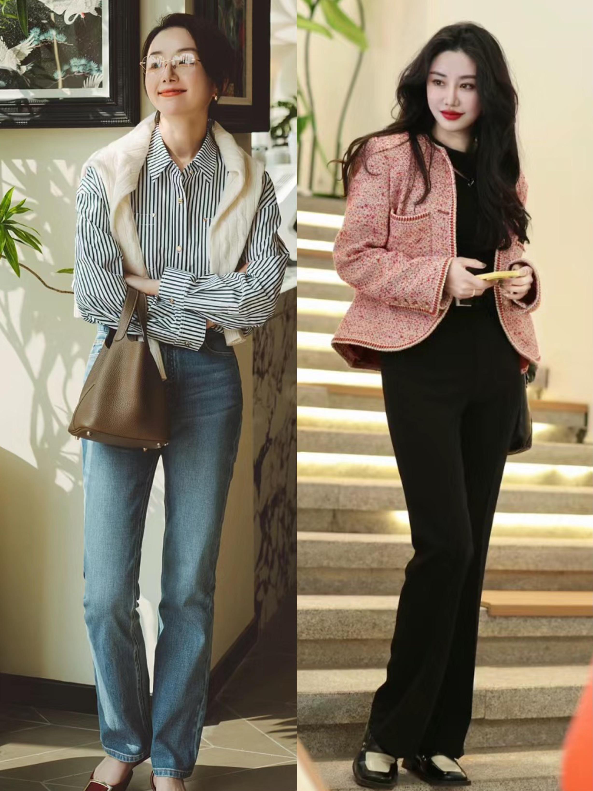 如果想要更加時髦精緻的穿搭,方跟鞋+喇叭褲的搭配,就是更好的選擇。方跟鞋或者小高跟的鞋子,都可以修飾身體比例,優化雙腿線條,塑造出更時尚的美感。