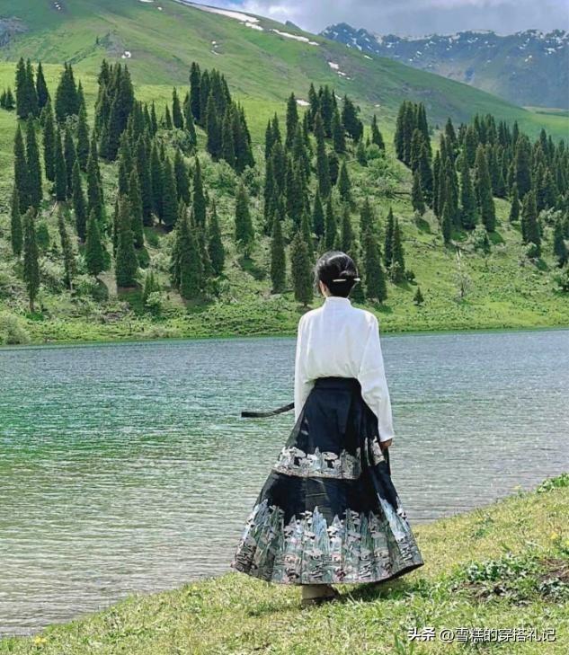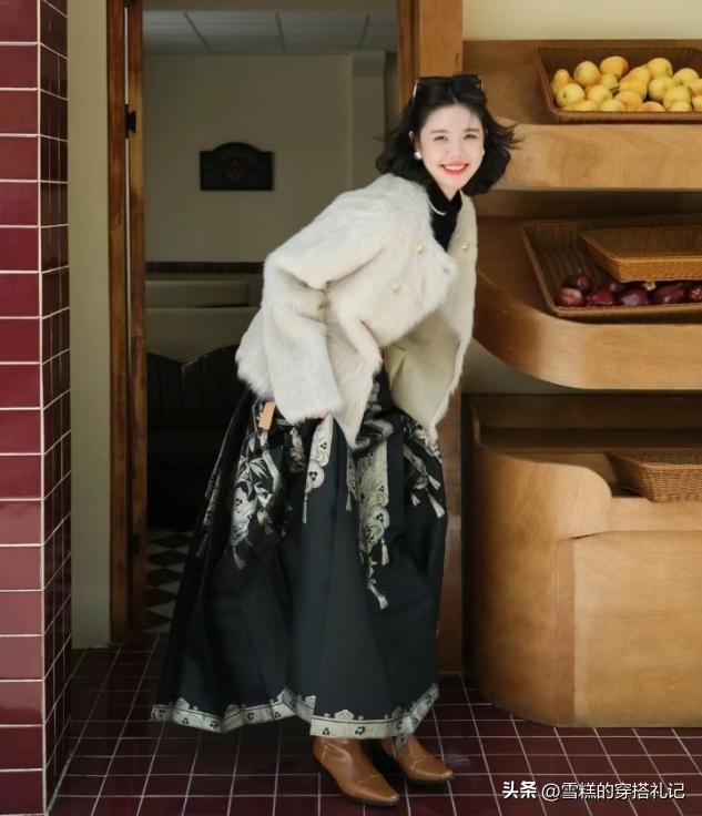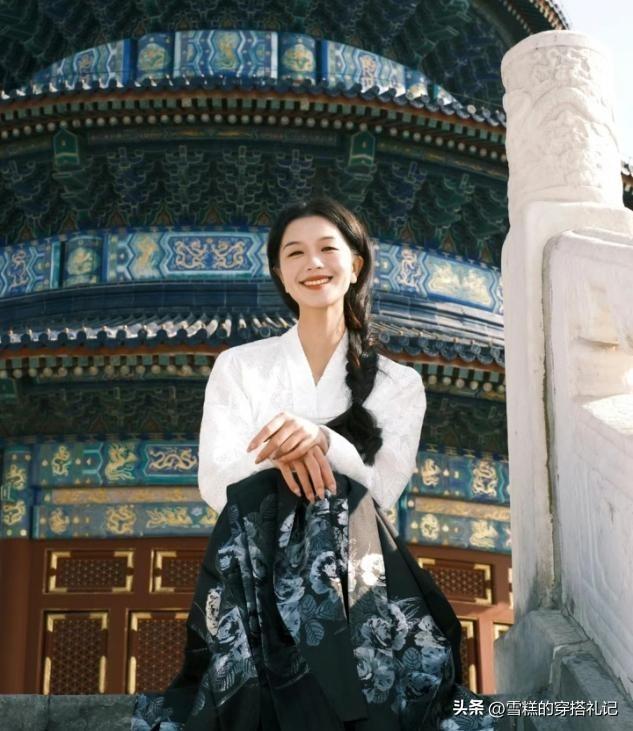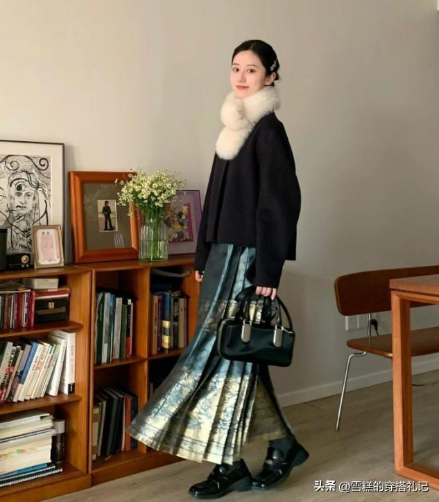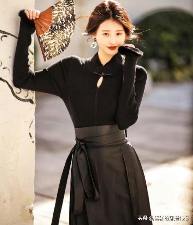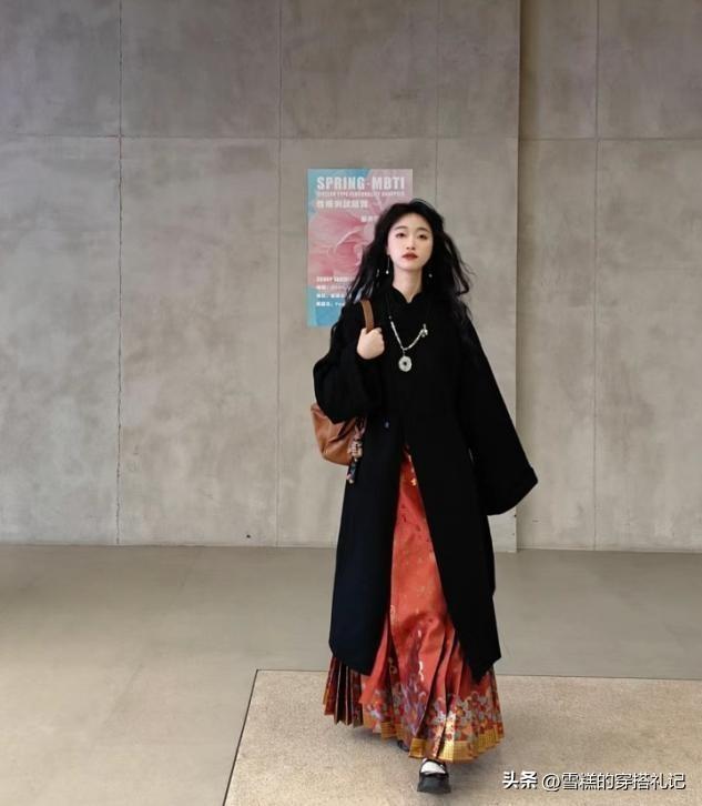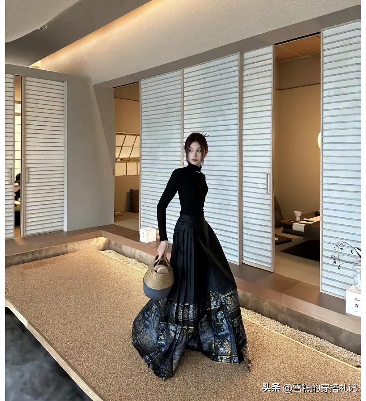 馬面裙的設計風格程度,遠比我們想象當中的更豐富,休閒場合當中,或許重工刺繡會看起來太過於扎眼,那麼,不妨像圖中一樣,用黑色作爲基礎色調,保留裙子的款式,刺繡減少也很適合日常正式場合。
