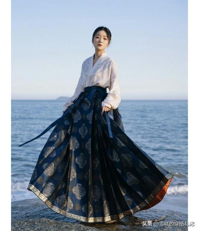 相信不少女生對於馬面裙的瞭解並不太多,但是因爲社交網站的刷屏,我們也知道這是一種帶有白褶紋的半身古典裙裝。