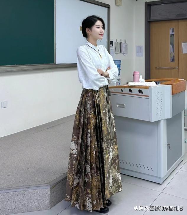 休閒的拍照場合,馬面裙的花紋成爲了獨一無二的視覺集中點,裙子面料增加更具有垂順感,層層疊疊的裙門,彰顯出了中式穿搭氣質的高雅之處。