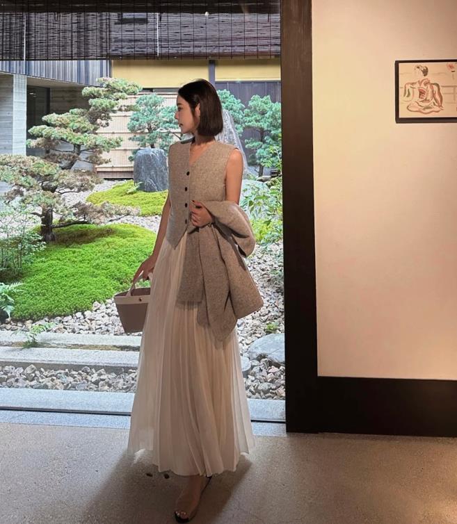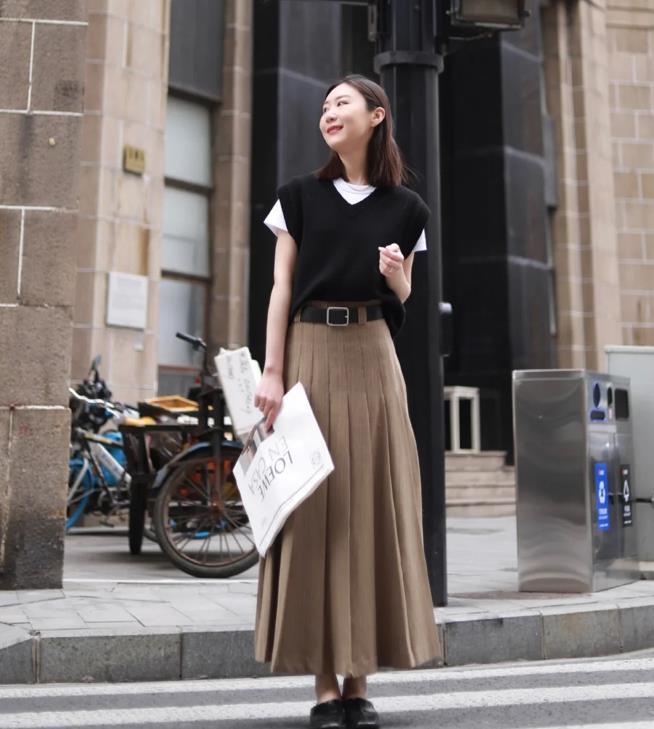 一鬆一緊的組合,就是能很好優化整個身材比例,顯瘦更藏肉,大百褶的半身裙,垂墜感和質感都是相當不錯的,穿起來不僅優雅,還很有氣質。