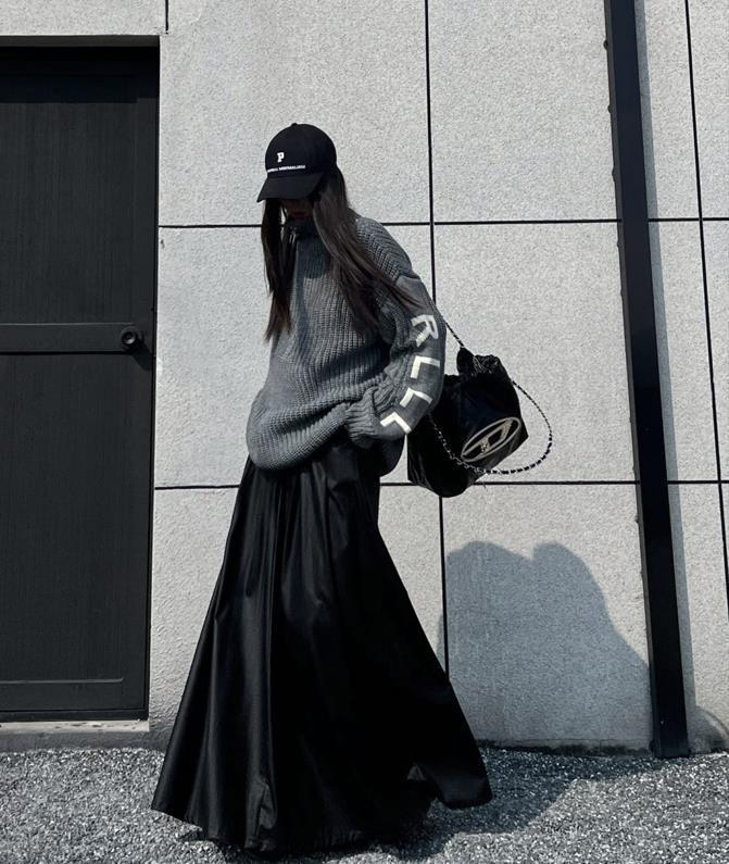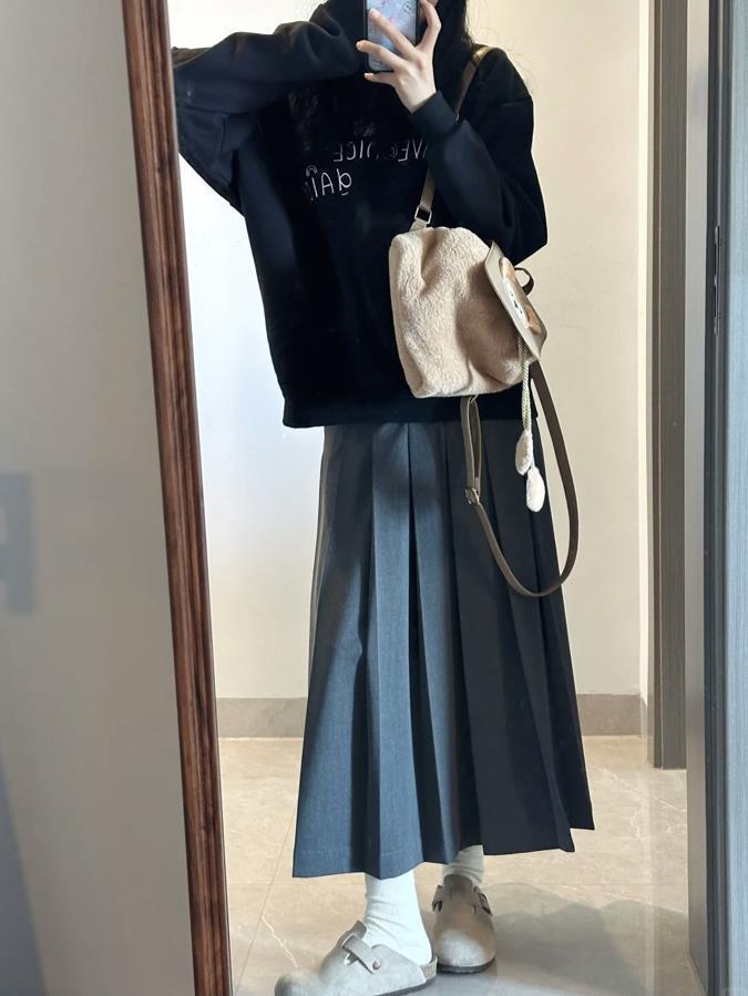 黑色、灰色這些配色組合,就是一點違和感都沒有,很高級時髦的配色組合,黑色連帽衛衣+灰色百褶半身長裙,大百褶的設計,穿起來就顯瘦。