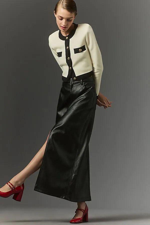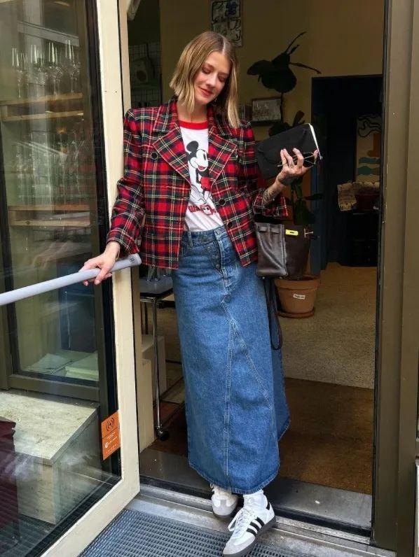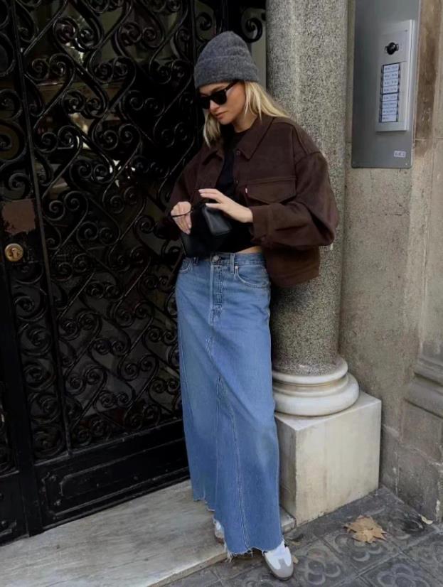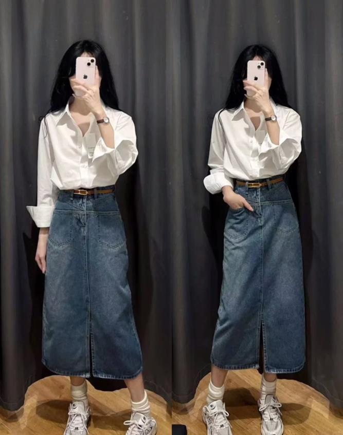 今年太流行這種長款牛仔裙了,版型顏色都好正,一點是挑不出毛病的,無論是大腿粗,還是胯寬的身材都能駕馭。裙襬處開叉的設計,具有設計感,又在不經意間拉長腿部線條。