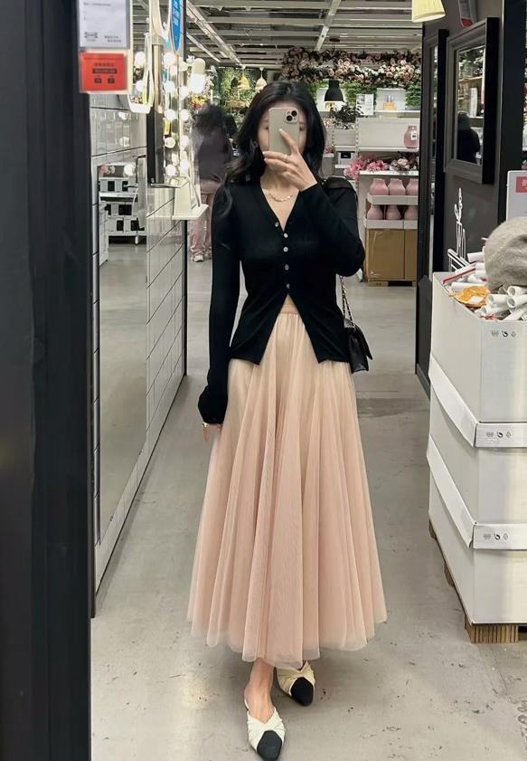 黑色修身針織衫+蓬鬆的紗質半裙,真的很讓人驚豔,裙子的版型偏a字形狀,不僅藏肉顯瘦,還能穿得優雅唯美。