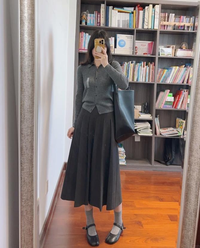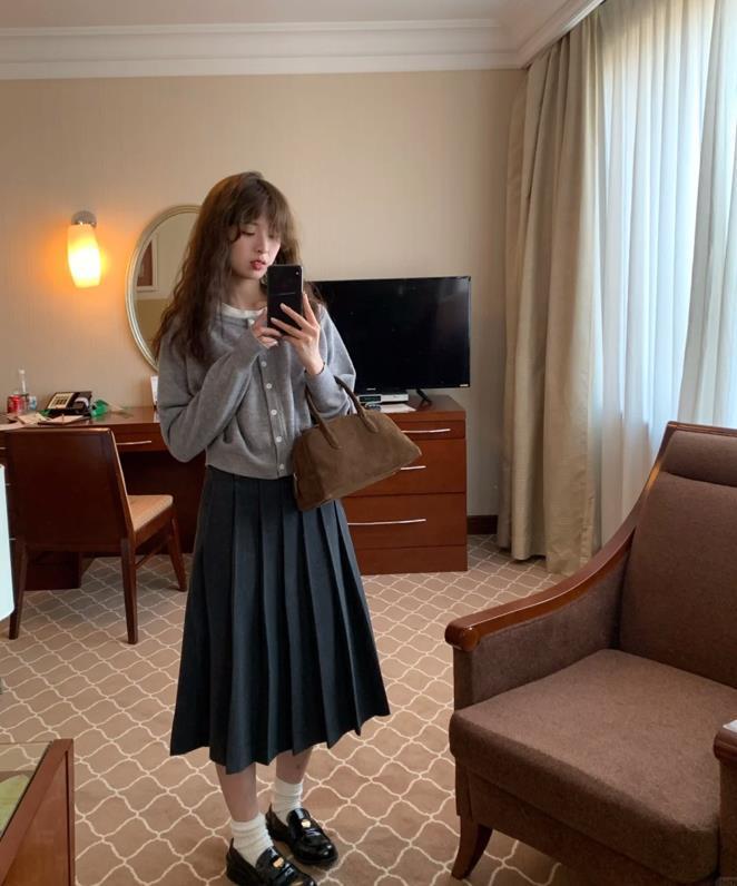 灰色的百褶裙真的永遠都穿不膩啊,實在是太好搭配了吧,不管是版型還是長度都很贊。