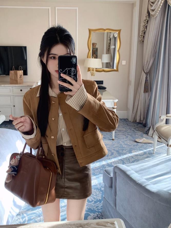 復古美拉德風的穿搭我愛了,棕色系的單品真的非常具有氛圍感,不要覺得這個色調只適合秋冬,其實春天照樣可以穿。鹿皮絨外套+皮短裙,簡直不要太絕了。