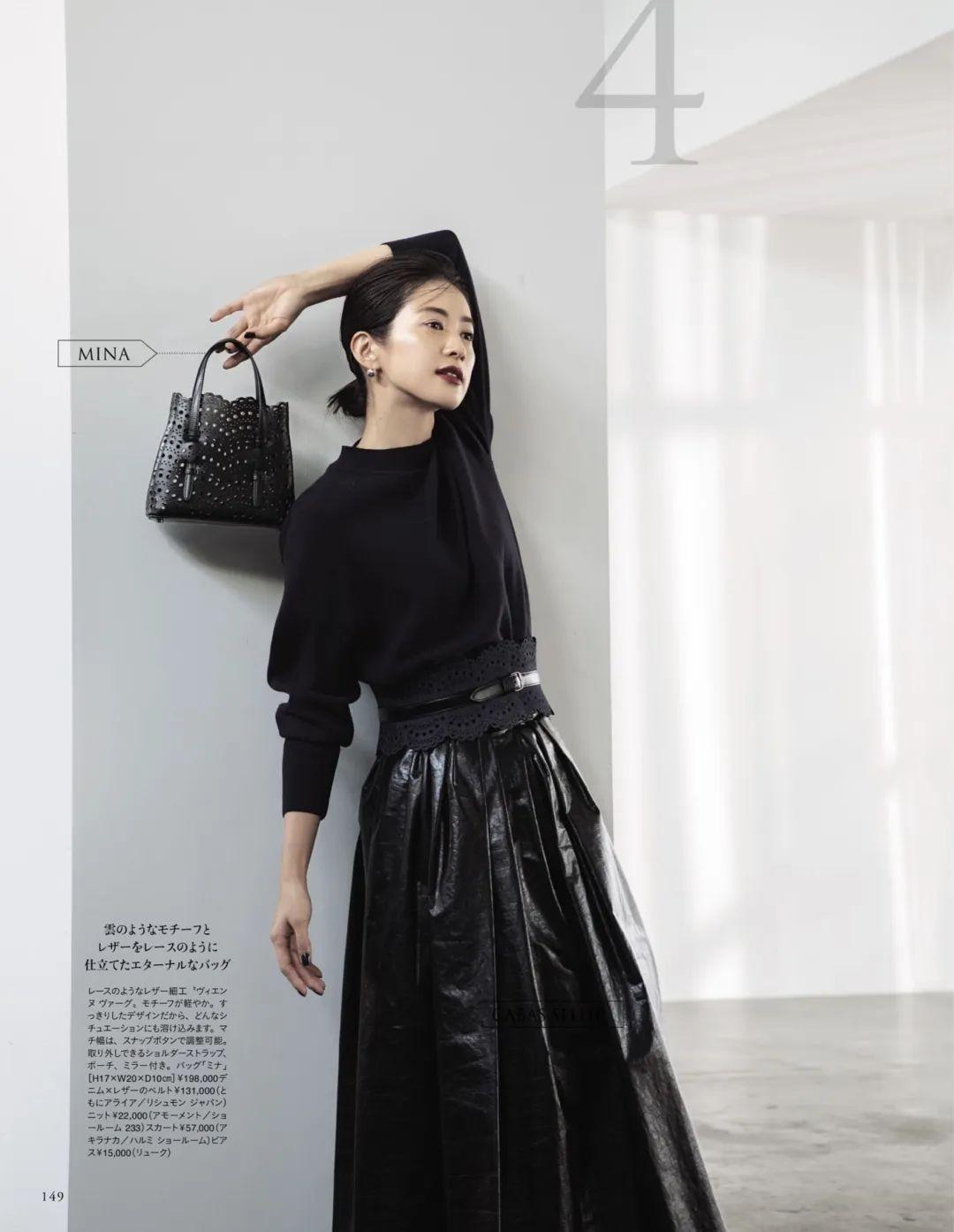 極簡風的穿搭,自帶氣場又不失帥氣,a字形狀的半身傘裙,遮胯又顯瘦,啞光的皮質質感,低調又不失高級。