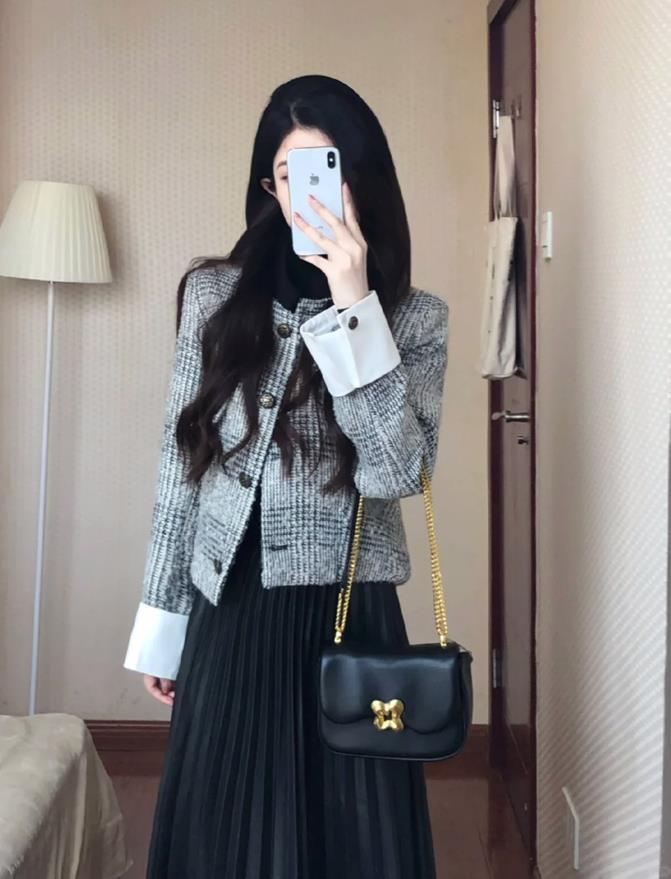 面料偏厚實,立體有型,選擇一件淺色針織衫來配,可溫柔氣質了。