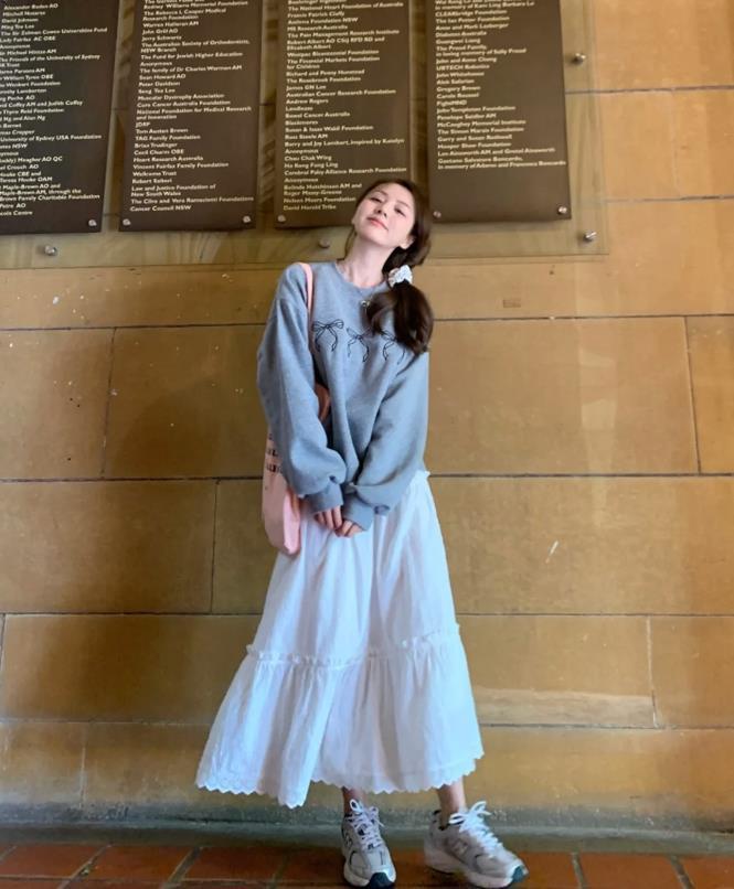 日常休閒感穿搭,看起來就非常舒適,衛衣和白色半身長裙的搭配,好韓好好看,不管是上衣,還是裙子,怎麼搭配都好看。