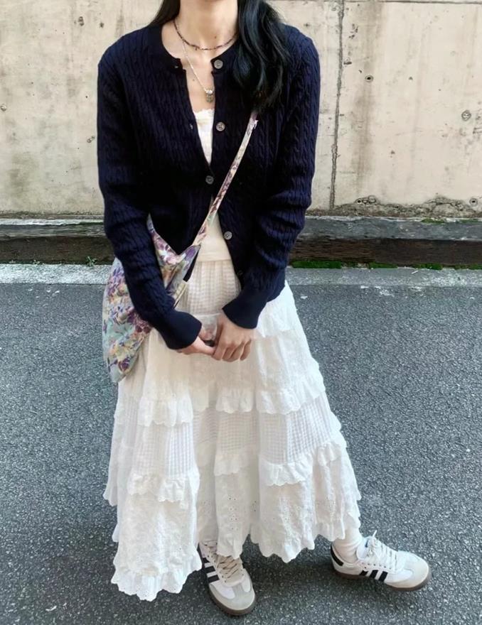 春天還得是小白裙啊,這套好好看哦,不管是配色,還是服飾的搭配,有種溫柔少女感。白色半身長裙超級出片的,搭配吊帶背心和針織開衫,一整個韓系溫柔。
