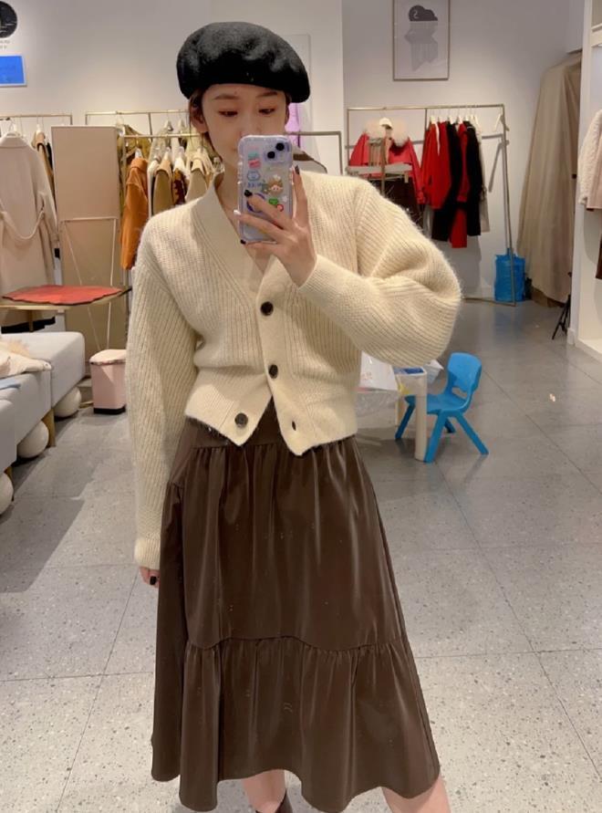 摩卡棕色調皮質半裙,它的版型是偏a字形狀的,對於梨形身材的姐妹可友好了,藏肉更顯瘦。上衣配的是一件綠色針織衫,太吸睛洋氣了。