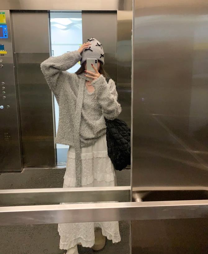早春,給自己選擇一條白色仙女裙吧,搭配灰色毛衣,韓女的風格就打造了,灰色+白色的配色組合,很耐看時髦,也不失高級感。