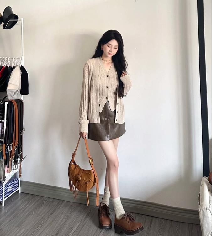 這套很適合春秋季節,針織開衫兩件套,內外都是針織衫,不過長度不同,這麼組合在一起,還挺顯層次的。選擇了一條半身皮裙來配,日常又顯氣質。