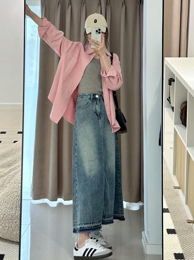 粉色襯衫+牛仔半裙,乾乾淨淨又顯嫩的穿搭,好春天啊,襯衫直接當外套穿,這樣多了幾分隨性。