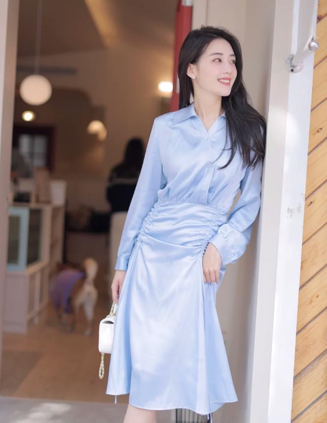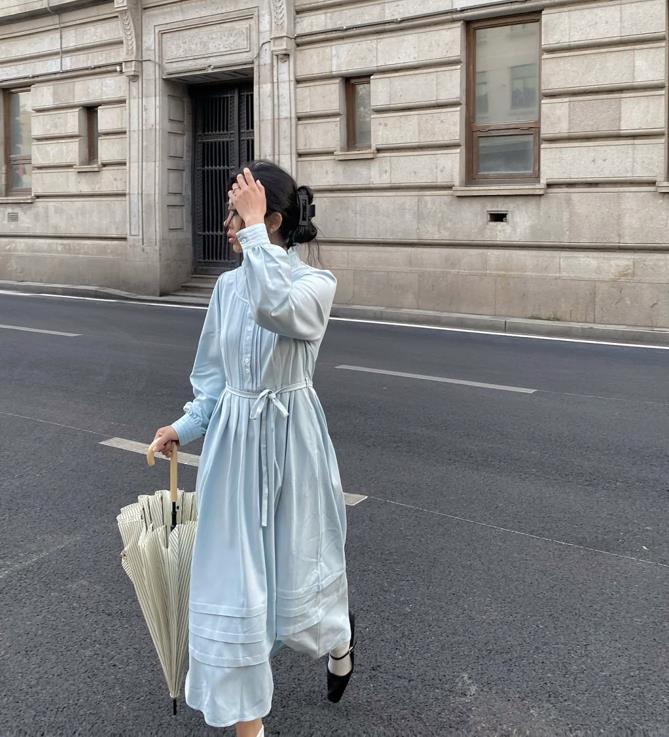 這一套真的好適合黃黑皮啊,裙子是淡淡的冰川藍,面料是有些厚度的,這個天氣穿上剛好。搭配一雙黑色的瑪麗珍單鞋,溫柔又乖巧。