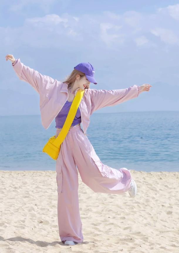 春天就是主打一個穿得舒適,這套丁香粉紫色的套裝,看起來就很舒服啊,運動套裝,加上運動鞋,青春又充滿活力。